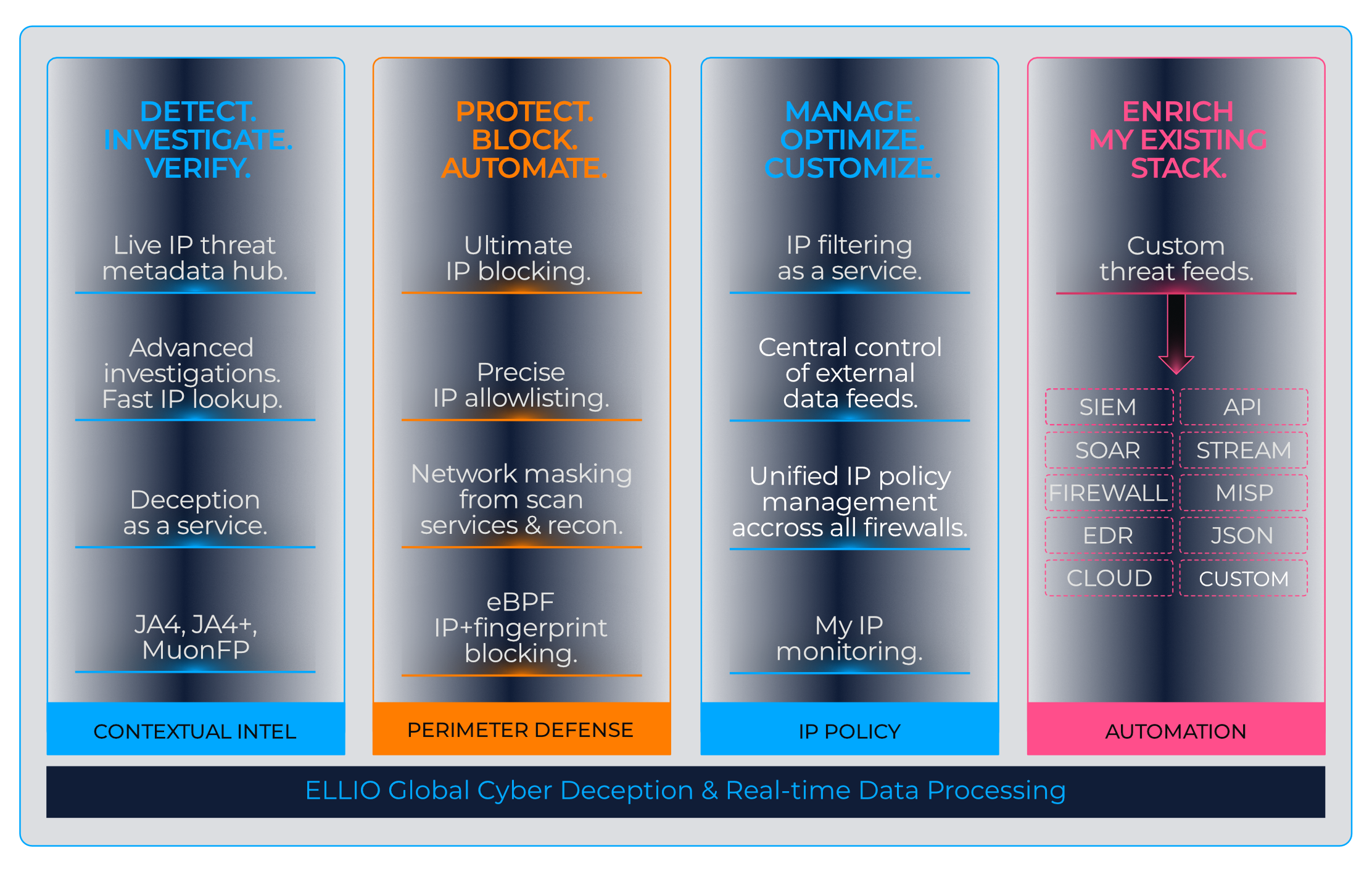 Join forces with ELLIO, a research lab with a deep focus on mass exploitation and reconnaissance activity. Benefit from a new generation of IP threat intelligence and adaptive defense tools, built for complex, AI-driven attacks.